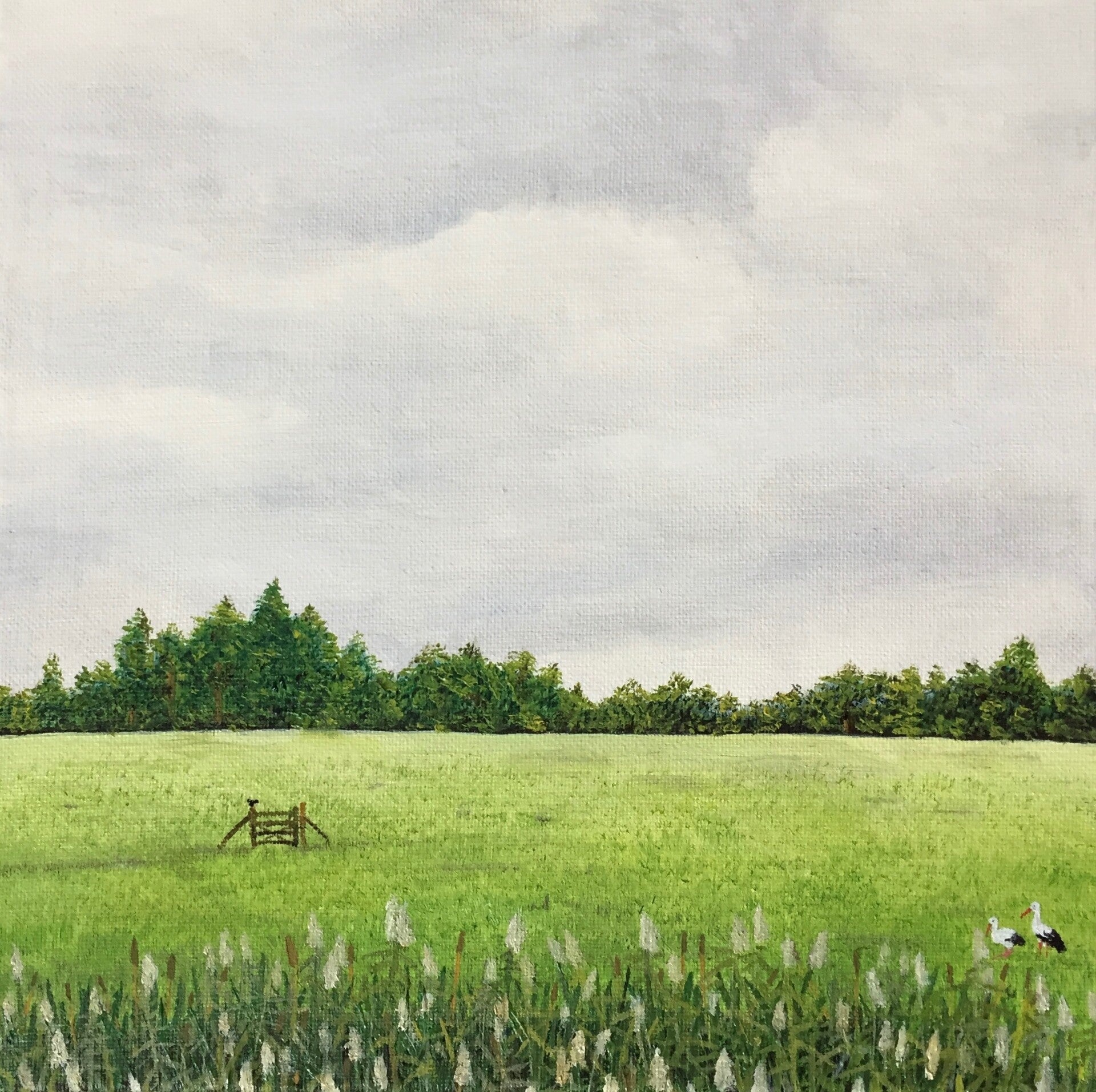 Polderlandschap onder een bewolkte lucht. In het veld zijn 2 ooievaars te zien, en er zit een kraai op het hek.