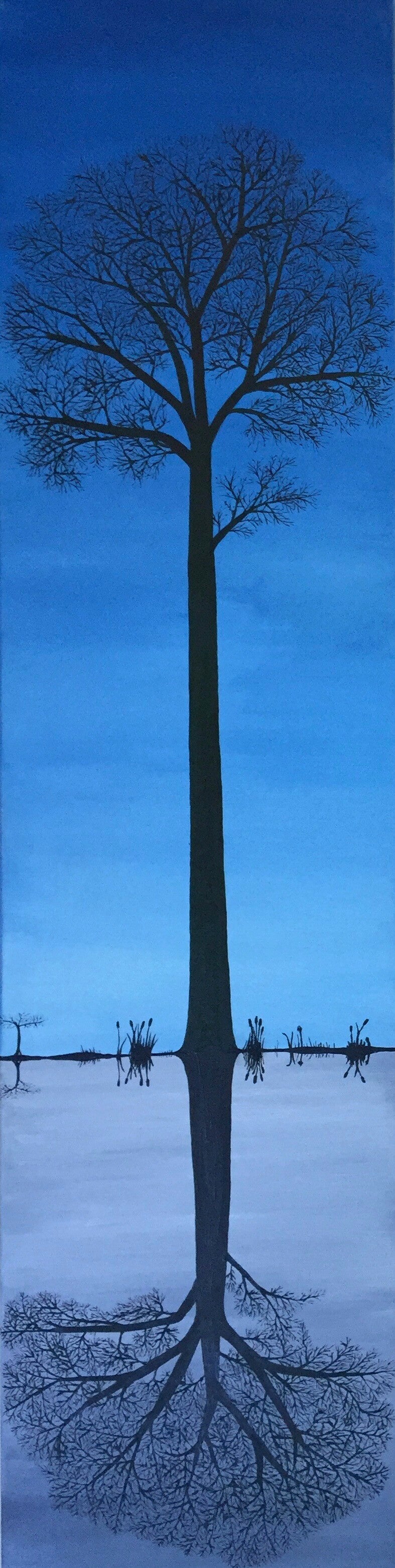 Op dit schilderij staat een kale boom voor een helderblauwe avondlucht. De boom is weerspiegeld op een grijze lucht. Het schilderij kan ook omgekeerd opgehangen worden en geeft dan een heel ander effect.