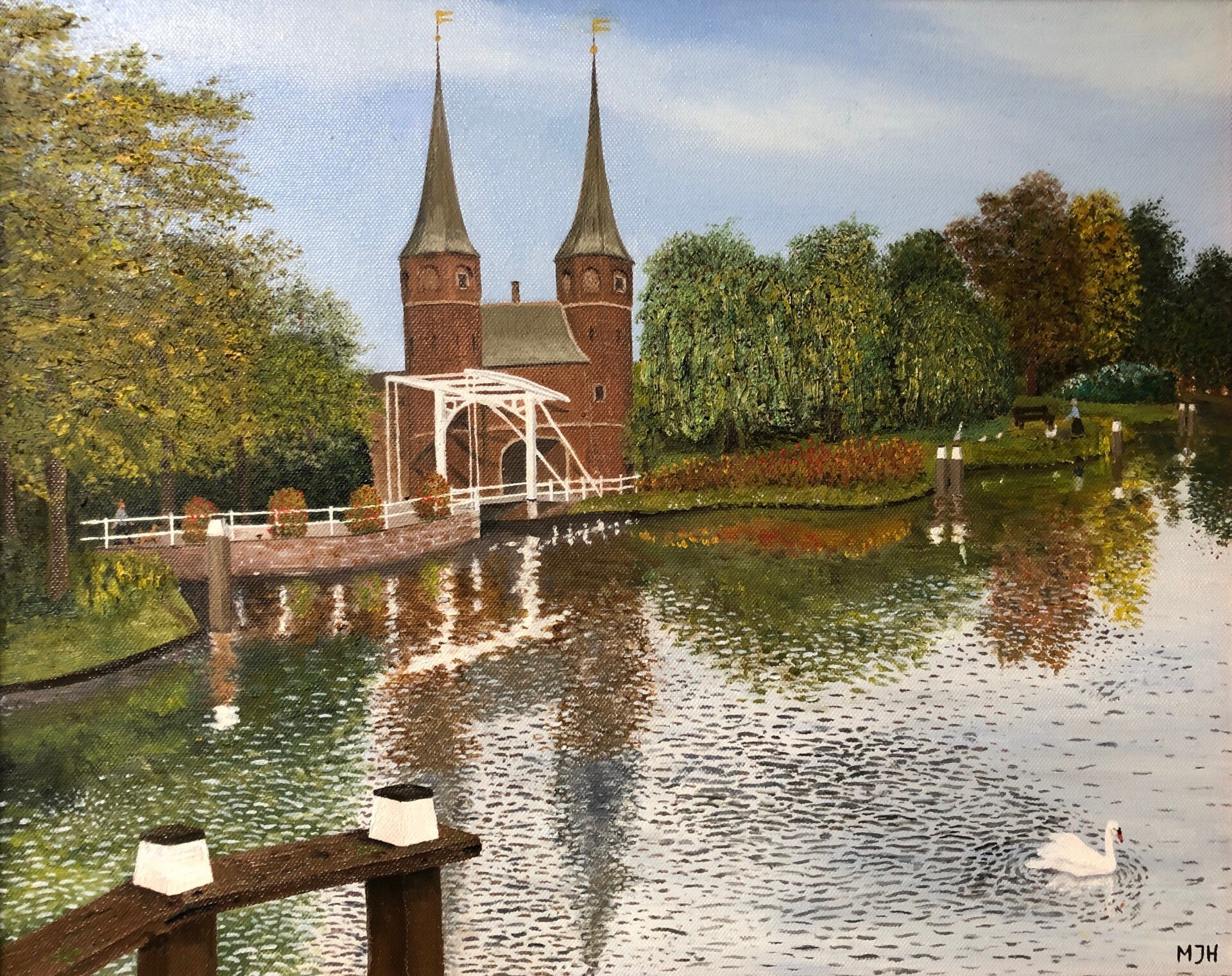 De enige overgebleven stadspoort van Delft met witte ophaalbrug. Op de voorgrond staan twee aanmeerpalen. De omgeving is wat groener gemaakt dan het in werkelijkheid is.